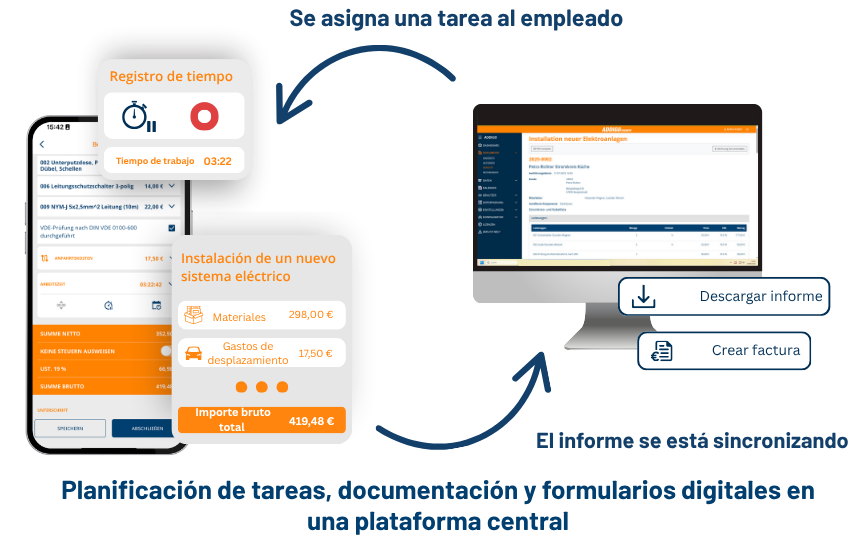 Acaba con el caos de los papeles y empieza a crear informes digitales. ADDIGO combina la planificación de tareas, la documentación y los formularios digitales en una plataforma centralizada para empresas con servicio in situ. Registra digitalmente las horas de trabajo y el consumo de material directamente durante la tarea en el informe o en el informe de dirección. Todos los datos se transfieren automáticamente a la oficina.