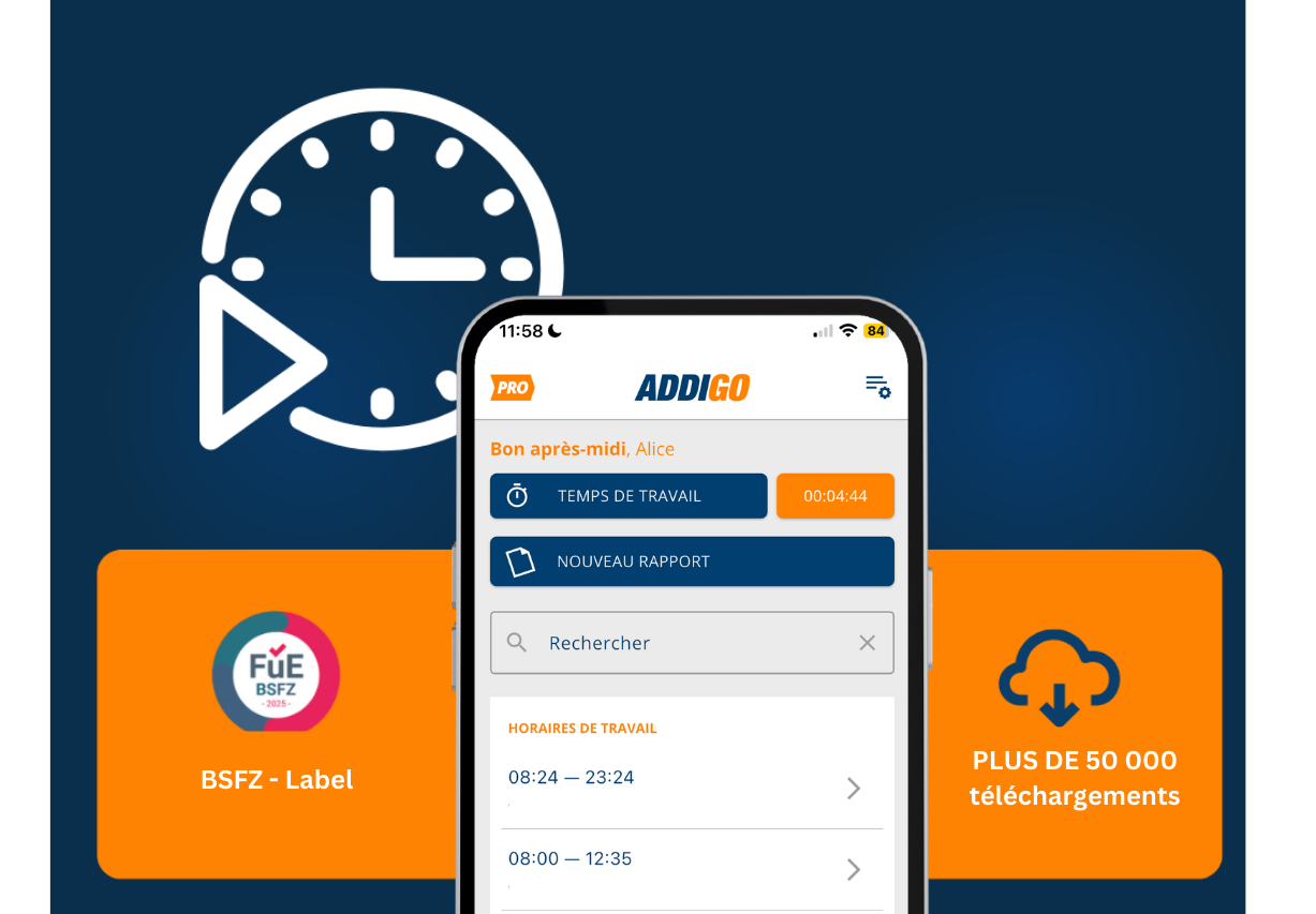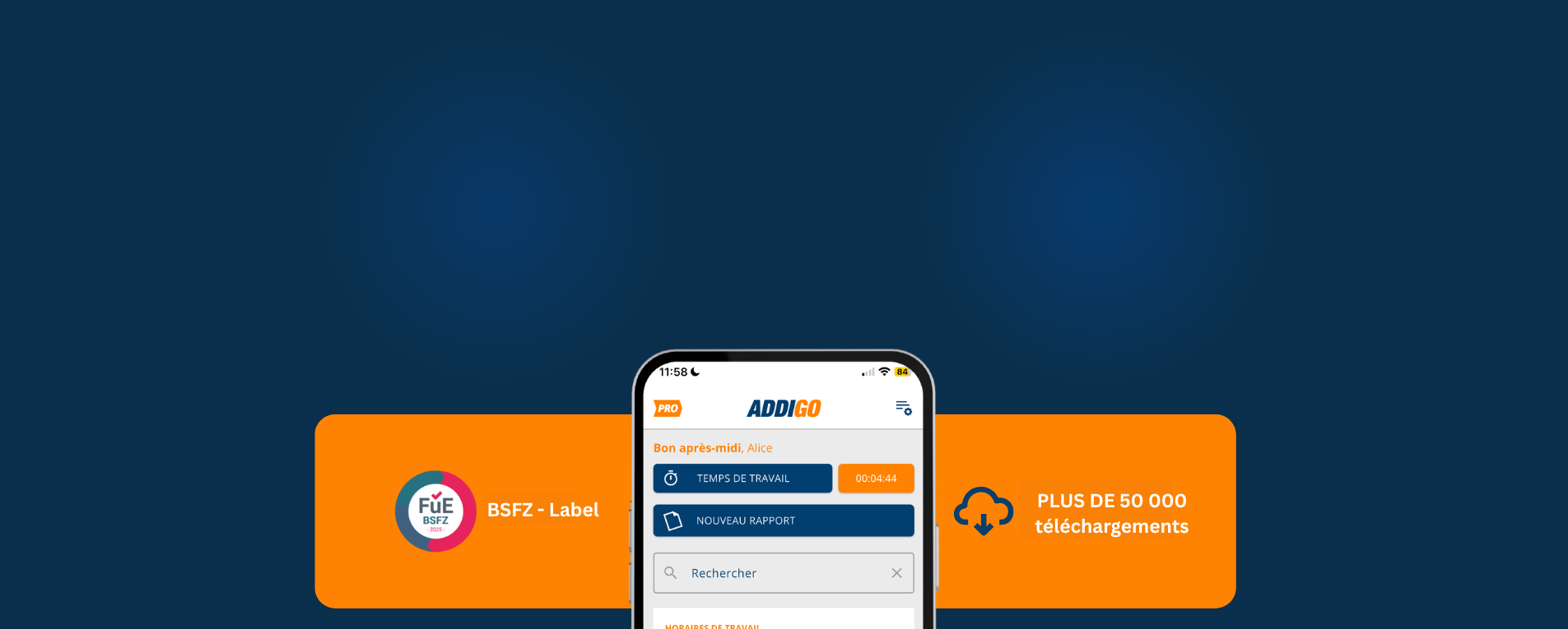 L’obligation légale d’enregistrer les temps de travail pose de nouveaux défis à de nombreuses entreprises. Avec l’application ADDIGO, transformez cette obligation en opportunité. Vos employés enregistrent leurs temps de travail, leurs pauses et leurs temps de trajet de manière mobile et numérique, directement sur place. Toutes les données sont automatiquement transférées vers le cockpit ADDIGO. Vous gardez ainsi une vue d’ensemble, en toute conformité avec la loi, de manière efficace et sans papier.