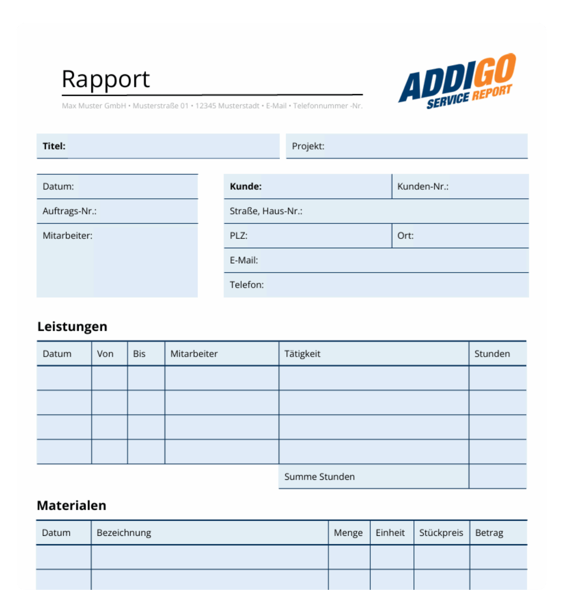 Schluss mit Zettelchaos, fang an digitale Rapportzettel zu erstellen. ADDIGO verbindet Einsatzplanung, Dokumentation und digitale Formulare in einer zentralen Plattform für Unternehmen mit Vor-Ort-Service. Erfasse Arbeitszeiten und Materialverbrauch digital direkt beim Einsatz im Rapportzettel bzw. Regiebericht. Alle Daten werden automatisch ins Büro übertragen.